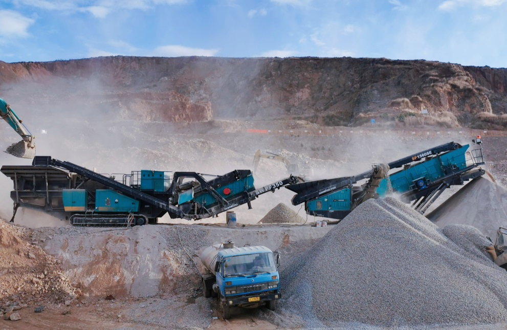 广袤的工地上,如展翅飞翔的雄鹰般摆放的5台山河普石勒破碎筛分设备正在飞速运转着,位于正中间“头部”位置的颚破主机张开“大嘴”,将石料源...